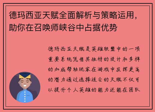 德玛西亚天赋全面解析与策略运用,助你在召唤师峡谷中占据优势