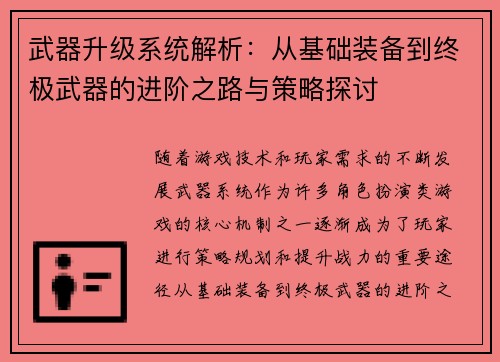 武器升级系统解析:从基础装备到终极武器的进阶之路与策略探讨